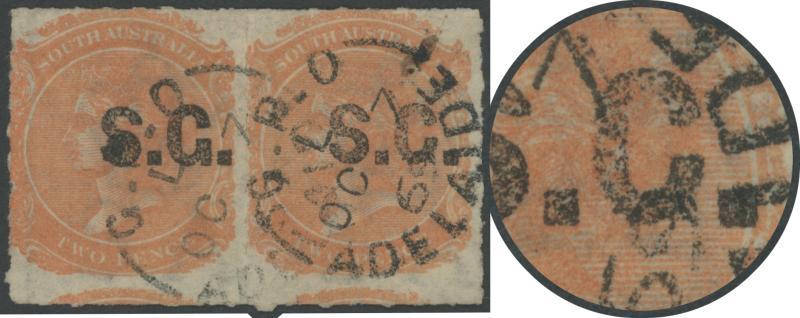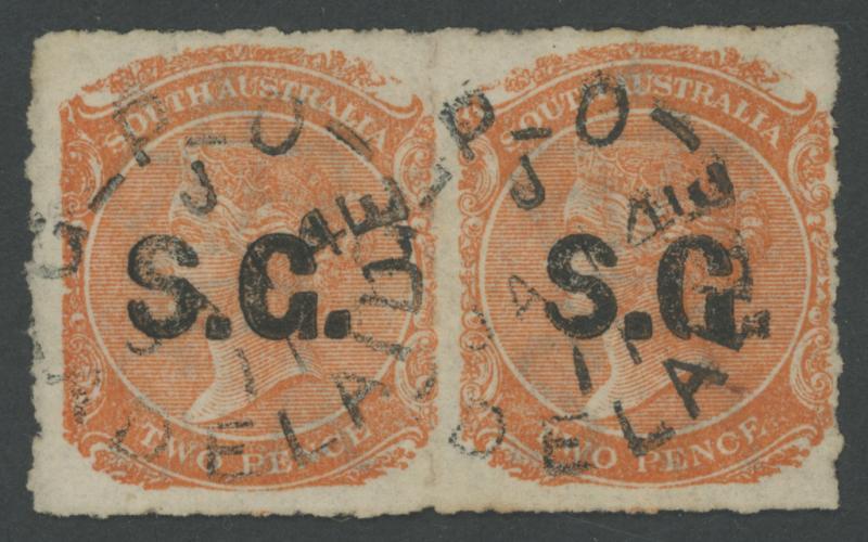 BLACK OVERPRINT: 'S.G.' on QV De La Rue Crown/SA Wmk Rouletted 2d deep orange SG DO506 horizontal pair, rouletting on all sides and between the units, GPO cds of 'JA14/71', Cat £170+ for singles. Rated R+. Superb. Don Pearce's similar marginal pair sold for $311 (Sale 247 Lot 784). [Date range 27.7.1869 to 14.1.1871] (Image1)