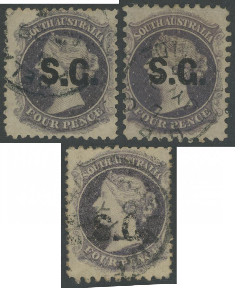 BLACK OVERPRINT: 'S.G.' on QV Perkins Bacon Large Star Wmk 4d purple (shades) comprising 1) Perf 11½-12½ SG DO509; 2) Perf 10 DO513; and 3) Irregular Compound Perf 11½-12½x11½-12½x10x11½-12½ DO515; light GPO cancels, Cat £210. Rated S S or R respectively; all unrecorded unused. Don Pearce's similar trio - graded 'A/A-' - sold for $323 (Sale 247 Lot 790). [Date ranges 1) 15.6.1869 to 24.8.1870; 2) 4.11.1870 to 23.7.1873; and 3) 4.7.1873 to 26.9.1876] (3) (Image1)