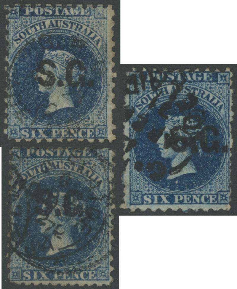 BLACK OVERPRINT: 'S.G.' on QV Perkins Bacon Large Star Wmk 6d Prussian blue comprising 1) Perf 10 SG DO514; 2) Regular Compound Perf 11½-12½x10 DO516var, a little aged; and 3) Regular Compound Perf 10x11½-12½ DO516var; each with GPO cds, Cat £400. Rated R RR & RR respectively; all unrecorded unused. [Date ranges 1) -.7.1872 to 1.3.1873; 2) & 3) 28.4.1871 to -.1.1873] (3) (Image1)