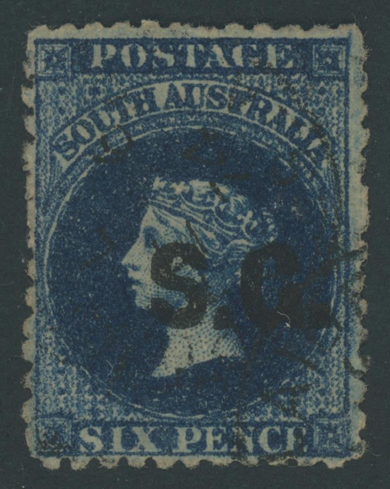 BLACK OVERPRINT: 'S.G.' on QV Perkins Bacon Large Star Wmk Perf 11½-12½ 6d Prussian blue SG DO510, remarkably well-centred, a little aged, light indistinct GPO cds, Cat £140. Rated RR; unrecorded unused. Ex Ron Butler (from a group lot). Chris Ceremuga Certificate (2011) states "rare". The very fine 'Besancon' example sold for SFr121 but Don Pearce's repaired example sold for $275 (Sale 247 Lot 796). (Image1)