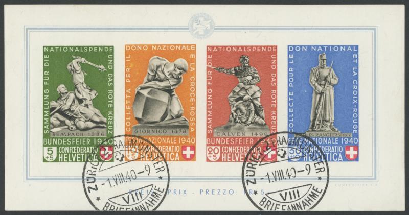 1940 Pro Patria National Fete & Red Cross Fund M/S SG MS404a (Michel Block 5), two neat strikes of Zurich 1940 cds cancel, Cat £950 (€700). (Image1)