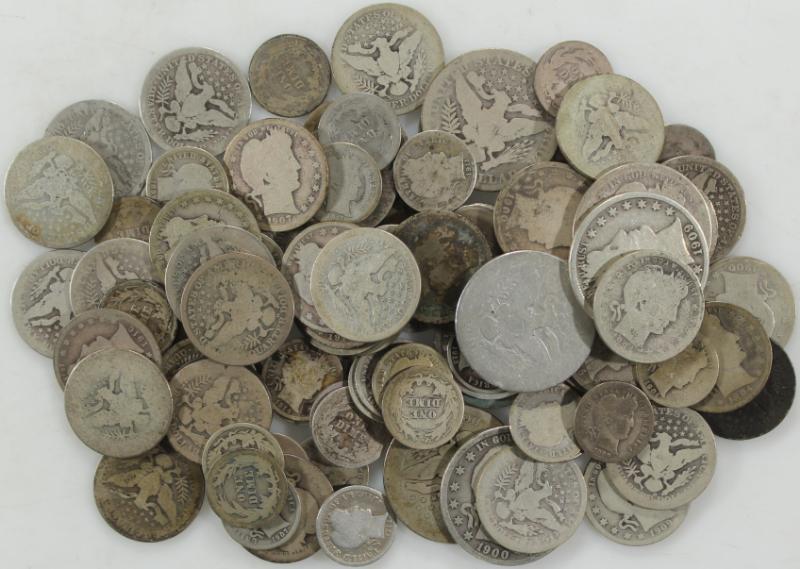 $20 face Barber Coins well-worn. Mixed Dimes, Quarters, & Halves. (Image)