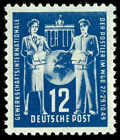 12 Pfennig Gewerkschaft, Marke mit Plattenfehler "Farbfleck rechts unter Tasche der Postbotin sowie oben links neben Afrika", postfrisch, leichte Fingerspuren, Mi. 150.- (Image 1)(Image)