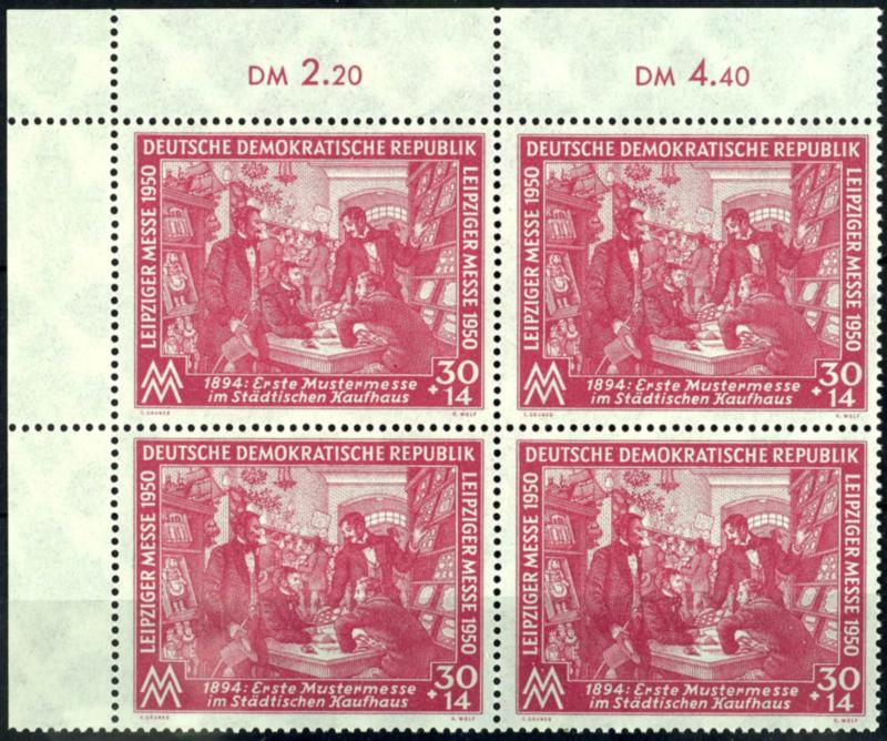 30 Pfennig "Leipziger Messe", Plattenfehler II "verkürztes K". Marke im postfrischen Viererblock aus der linken oberen Bogenecke. Mi.186.- (Image 1)(Image)
