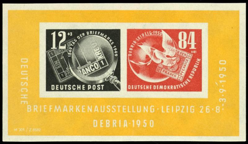 Blockausgabe "Debria" mit seltenem Plattenfehler III "schräger weißer Strich über 1 des Datums 9.3.1950 am rechten Blockrand" (nur in einer Teilauflage vorkommend), einwandfrei postfrisch, Mi. 500.- (Image 1)(Image)