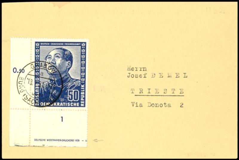 50 pfennigs German-Chinese friendship on properly franked international letter from Grabow 13.7.51 to Triest / Italy. Stamp from the left lower corner of the sheet with printers mark. (288DV)