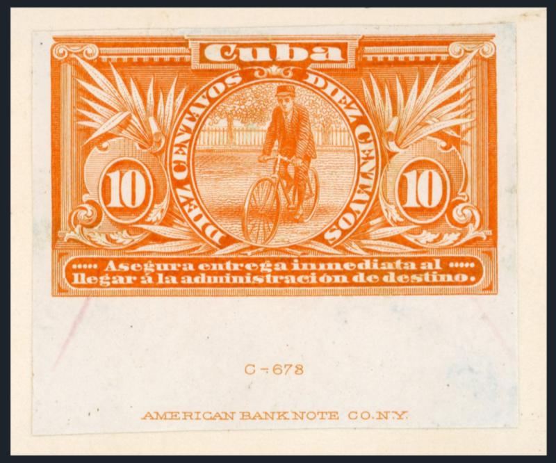 US Military Rule 1899 Special Delivery 10c orange 'Bicycle' imperf American Bank Note proof with ornaments added bottom left and right, an imperf bottom marginal with inscription affixed to thick card, unused. Very rare, one of only two recorded. (Image)
