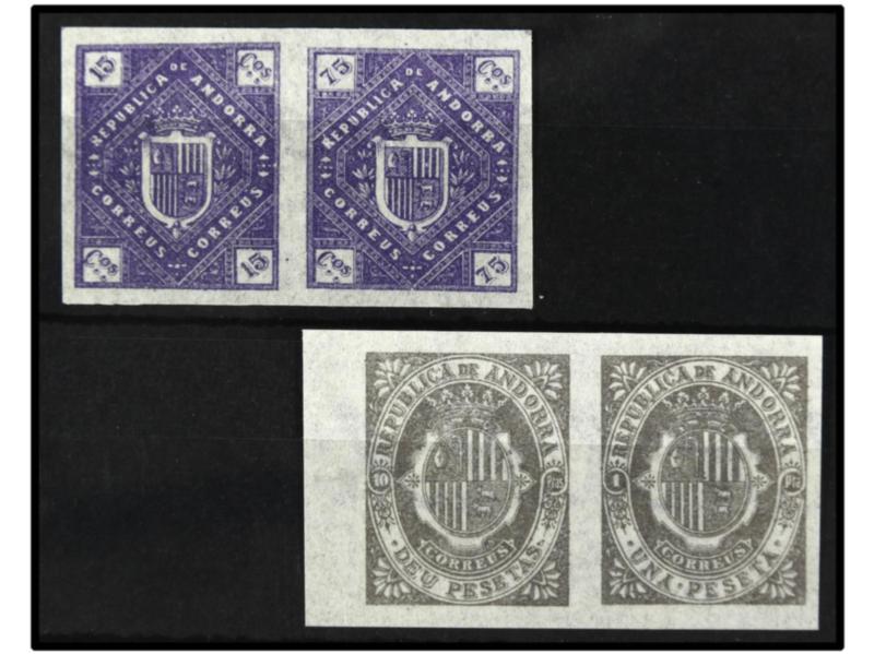 ANDORRA. Conjunto de 11 sellos en parejas o tiras de tres, un sello CAPICUA, sin dentar. MUY RAROS. Ed.NE 1/12sii sin el 8saii. Cat. 854€. (Image1)