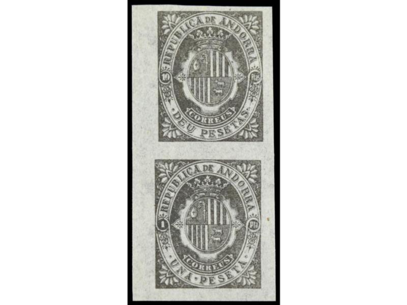 ANDORRA. 15 cts. violeta y 10 pts. gris ERRORES DE COLOR sin dentar en parejas verticales junto al sello normal. Ed.NE 3ecs, 12ecs. (Image1)