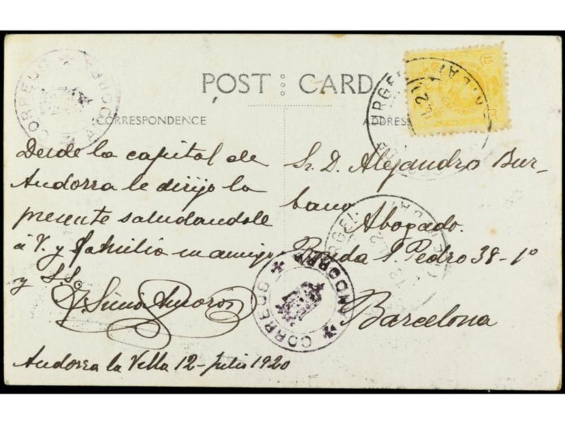 COLONIAS ESPAÑOLAS: ANDORRA. 1920. ANDORRA LA VIEJA a BARCELONA. 15 c. amarillo, mat. fechador SEO DE URGEL, y marcas CORREUS / ANDORRA en violeta. MUY RARA. Ed.271. (Image1)