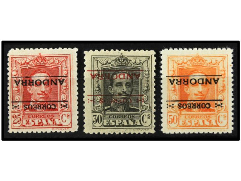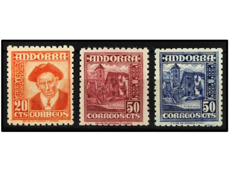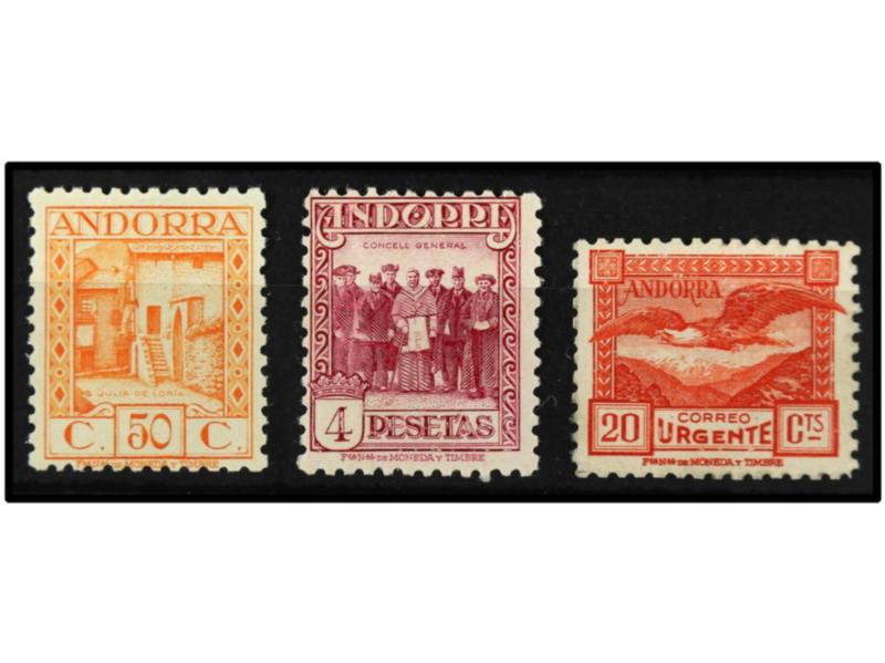ANDORRA. 50 cts., 4 pts. y 20 cts. urgente, dent. 11 1/2 con numeración A000,000 MUESTRA. Cert. CEM y COMEX. Ed.23dN, 25dN, 27dN. Cat. 1.365€. (Image1)