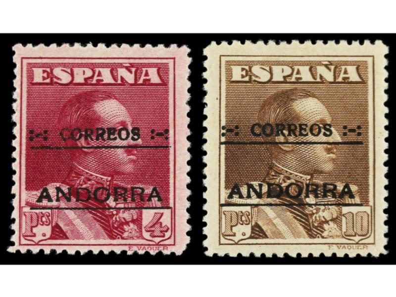 ANDORRA. 4 pts. carmín violeta y 10 pts. castaño. Dentado 14. Muy bonitos. Ed.11d, 12d. Cat. 715€. (Image1)