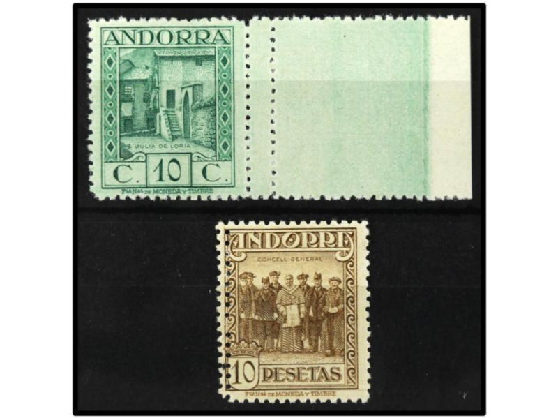 ANDORRA. 10 cts. verde y 10 pts. castaño DOBLE DENTADO VERTICAL. No reseñados. Ed.17dd, 26dd. (Image1)