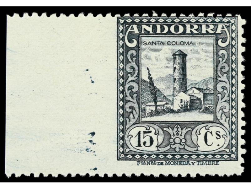 ANDORRA. 15 cts. verde SIN DENTAR margen izquierdo. RARÍSMO y no reseñado, pocos ejemplares conocidos. Firmado GALVEZ. Ed.18smi. (Image1)