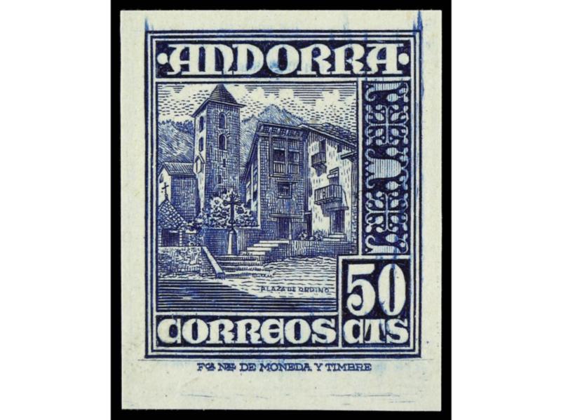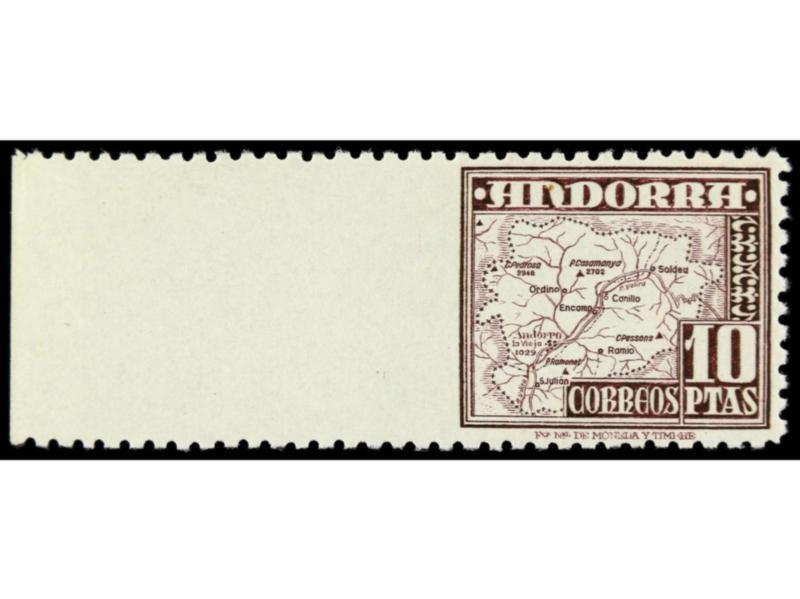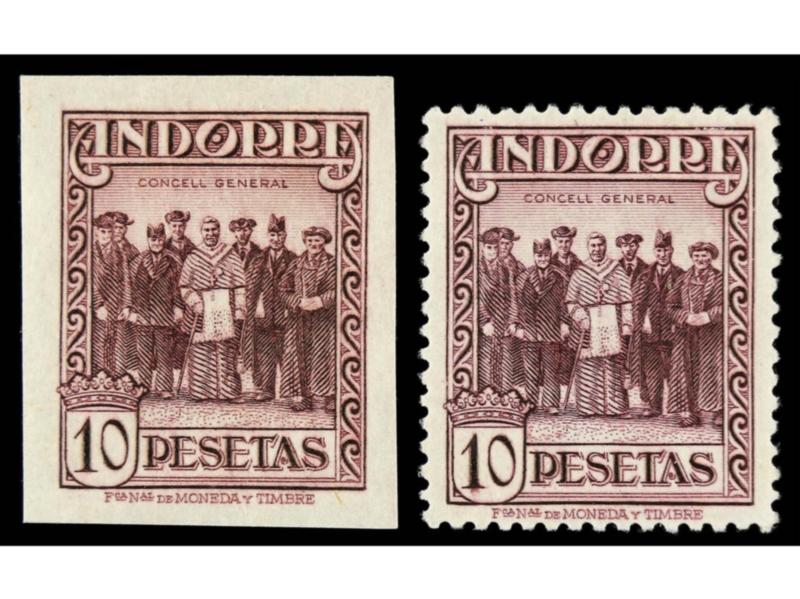 ANDORRA. 10 pts. violeta CAMBIO DE COLOR no reseñado. Dos sellos dentado y sin dentar. Ed.26ccb y ccbs. (Image1)