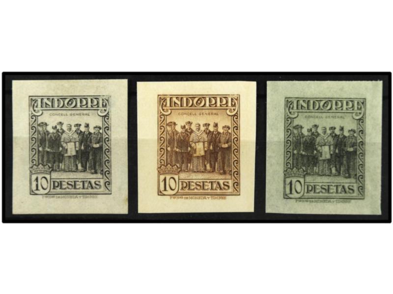 ANDORRA. 10 pts. Tres PRUEBAS DE PUNZÓN en color verde bronce, negro y castaño. Ed.26. (Image1)