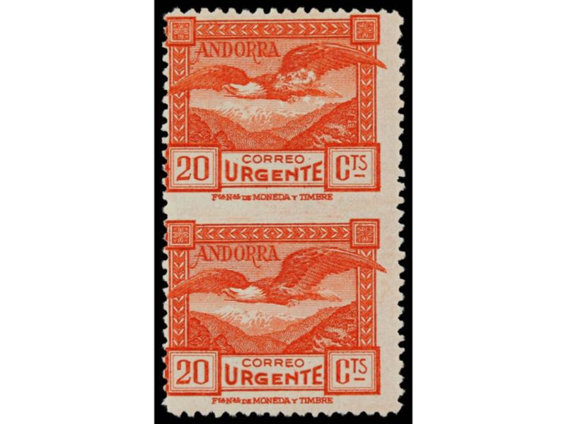 ANDORRA. 20 cts. rojo. Pareja vertical SIN DENTAR EN MEDIO. PRECIOSA y RARA. Ed.27spv. Cat. 775€. (Image1)