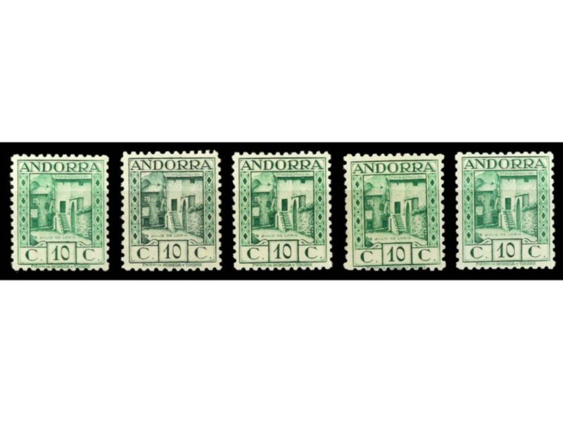 ANDORRA. CAMBIOS DE COLOR. Juego completo a falta del 1 pta. violeta carmín. RARO CONJUNTO. Ed.17cc/26cca sin 24cc. Cat. 6.705€. (Image1)