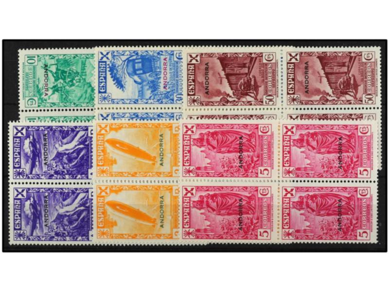 COLONIAS ESPAÑOLAS: ANDORRA. SERIE COMPLETA. 14 valores en bloques de cuatro. 40 cts., 50 cts. y 1 pta. numeración ceros y 4 y 10 pts. numeración privada. Ed.1/14 (4). (Image1)