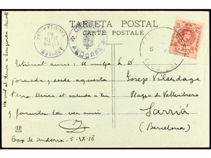 ANDORRA. 1918. TARJETA POSTAL a BARCELONA con sello español de 10 c., mat. fechador SEO DE URGEL. Marcas en azul CORREUS/ANDORRA y ANDORRE/VAL D´ANDORRE/23 JUIN/82. RARA. (Image1)