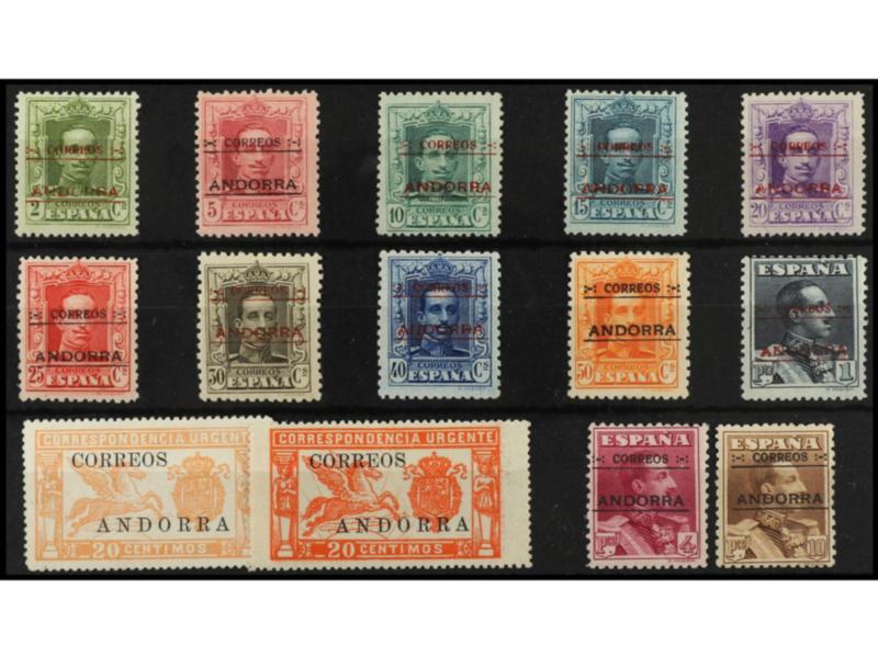 COLONIAS ESPAÑOLAS: ANDORRA. SERIE COMPLETA, 14 valores. Bien centrados y numeraciones originales. RARA en esta calidad. Ed.1/14. Cat. +940€. (Image1)