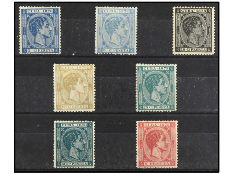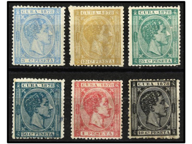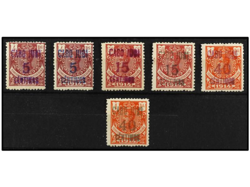 COLONIAS ESPAÑOLAS: CABO JUBY. 6 valores. Sobrecarga emisión 1916, SOBRE SELLOS DE GUINEA en vez de Río de Oro. 5 c. violeta y 5 c. azul s. 4 pts., 15 c. violeta y 15 c. verde s. 50 c., y 40 c. violeta y 40 c. verde s. 1 pta. Posibles pruebas no catalogadas. RARÍSIMOS. (Image1)