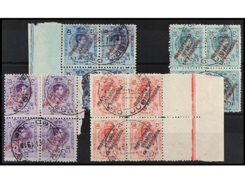 ESPAÑA. 15 cts. violeta, 25 cts. azul, 30 cts. verde y 40 cts. rosa. Bloque de cuatro sellos de Marruecos con matasellos CORREOS / CABO JUBY. RAROS. Ed.4F (4), 4H (4), 4I (4), 4J (4). Cat. 2.720€. (Image1)