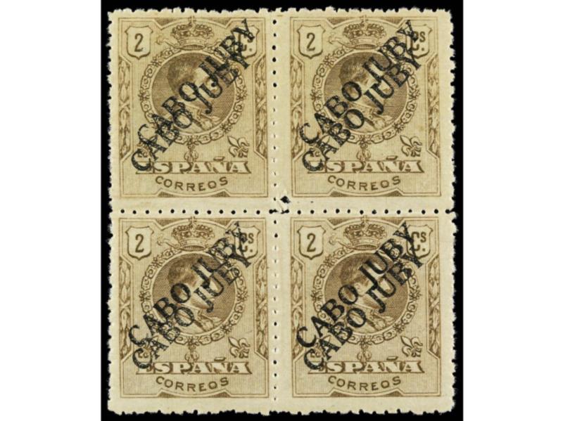 COLONIAS ESPAÑOLAS: CABO JUBY. 2 c. castaño, DOBLE HABILITACIÓN. BLOQUE DE CUATRO. Ed.6hh. Cat. 345€. (Image1)