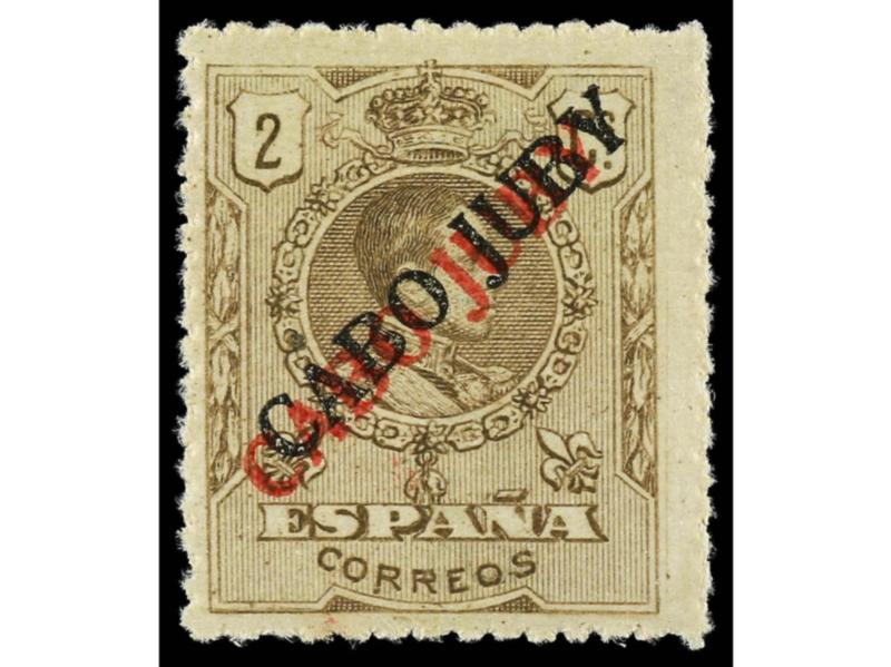 COLONIAS ESPAÑOLAS: CABO JUBY. 2 c. castaño, DOBLE HABILITACIÓN en rojo y negro. Ed.6hhcc. Cat. 240€. (Image1)