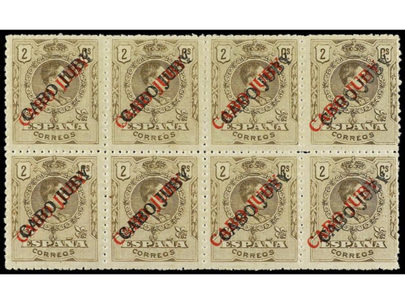 COLONIAS ESPAÑOLAS: CABO JUBY. 2 c. castaño, DOBLE HABILITACIÓN en rojo, uno ´J´ corta, y negro. BLOQUE DE OCHO. Ed.6hhcc. Cat. 1.920€. (Image1)
