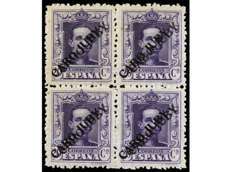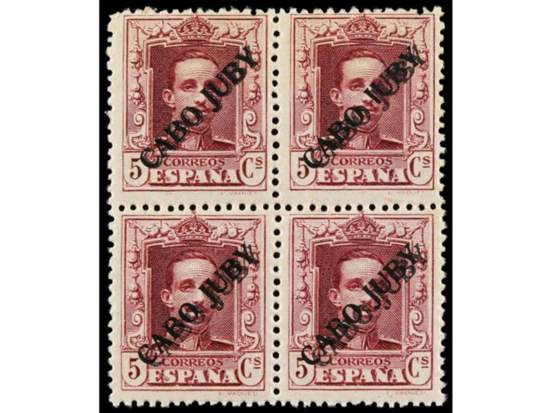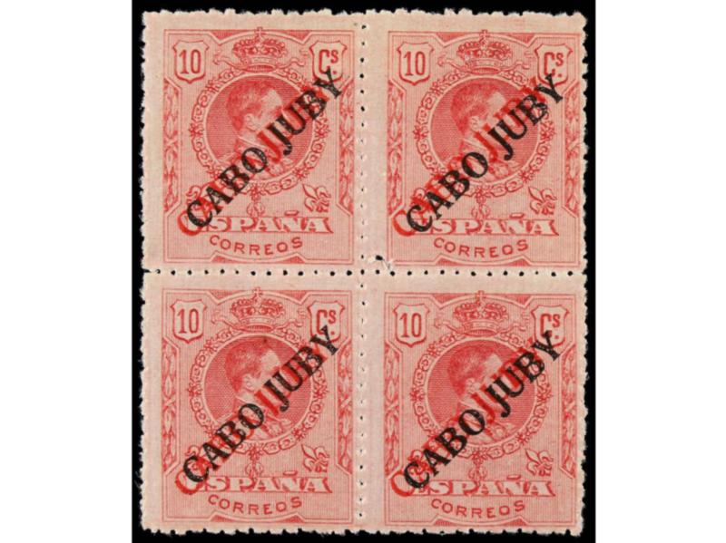 COLONIAS ESPAÑOLAS: CABO JUBY. 10 c. rojo, DOBLE HABILITACIÓN en rojo, uno ´J´ corta, y en negro. BLOQUE DE CUATRO. Ed.8hhcc. Cat. +960€. (Image1)