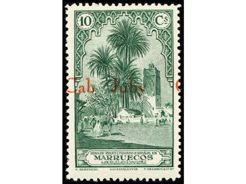 COLONIAS ESPAÑOLAS: CABO JUBY. 10 cts. verde. HABILITACIÓN EN COLOR DIFERENTE (ROJO) y ´CABO´ sin ´O´. MUY RARA variedad combinada. Ed.53hcchp. Cat. 900€. (Image1)