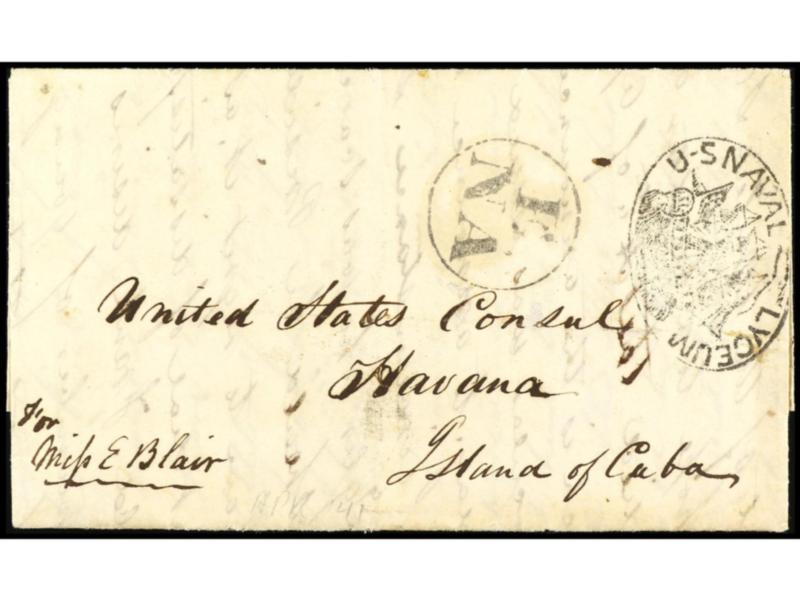 CUBA. 1841. WASHINTON - LA HABANA. Carta completa con texto dirigida al Cónsul U.S. en La Habana. Marca ovalada US NAVAL LYCEUM y a la llegada E/NA marca de la Empresa de correos Marítimos indicando que la carta llegaba de Norteamérica. PRECIOSA y rara combinación de marcas, única que conocemos. EX COL. Y. KOURI. (Image1)