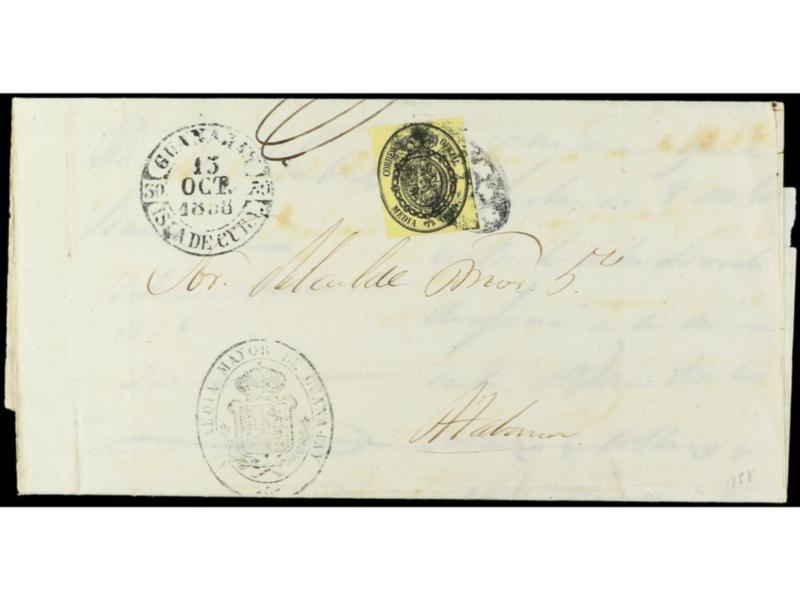 CUBA. 1858. GUANAJAY. Sobrescrito a HABANA. 1/2 onza y fechador GUANAJAY en negro (PE 2). (Image1)