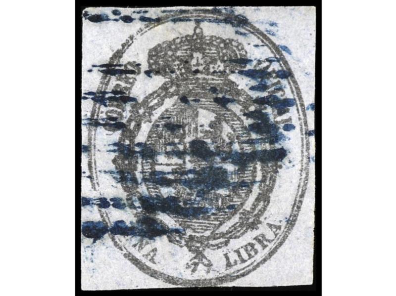 CUBA. 1 libra negro sobre azul. LITOGRAFIADO DE LA HABANA. Mat. parrilla en azul (muy rara en este color) de la Habana. Este raro sello fue considerado durante años como Falso Postal (firmado por el Dr. Roig como tal) aunque más tarde se descubrió que se trataba de una impresión local ante la escasez de estos sellos del Servicio Oficial en Cuba. PRECIOSO y MUY RARO. Cert. ECHENAGUSIA. Ed.9R. Cat. 980€. (Image1)