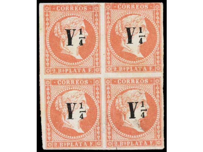 CUBA. Y 1/4 s. 2 reales rojo. Bloque de cuatro. Leves pliegues. Cert. COMEX y ECHENAGUSIA. RARO. Ed.10. (Image1)