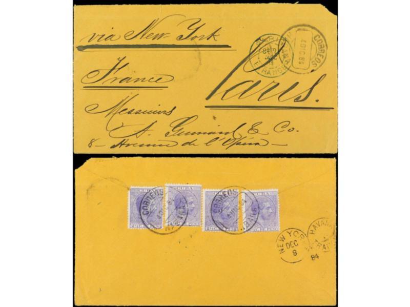 CUBA. 1884. HABANA a PARÍS. 2 1/2 ctvos. lila (4), al dorso marca NEW YORK / HABANA TRANSIT. MUY RARA marca, primera vez que la vemos aplicada a una carta con sellos. Ed.96 (4). (Image1)