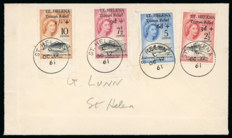 1961 (OC 12) local envelope franked with set of four of Tristan Relief Fund with first day of issues cancellations, a vertical and horizontal creased clear of adhesives, fine appearance. Only 434 complete sets were produced, only a small proportion were put on covers. (Image)