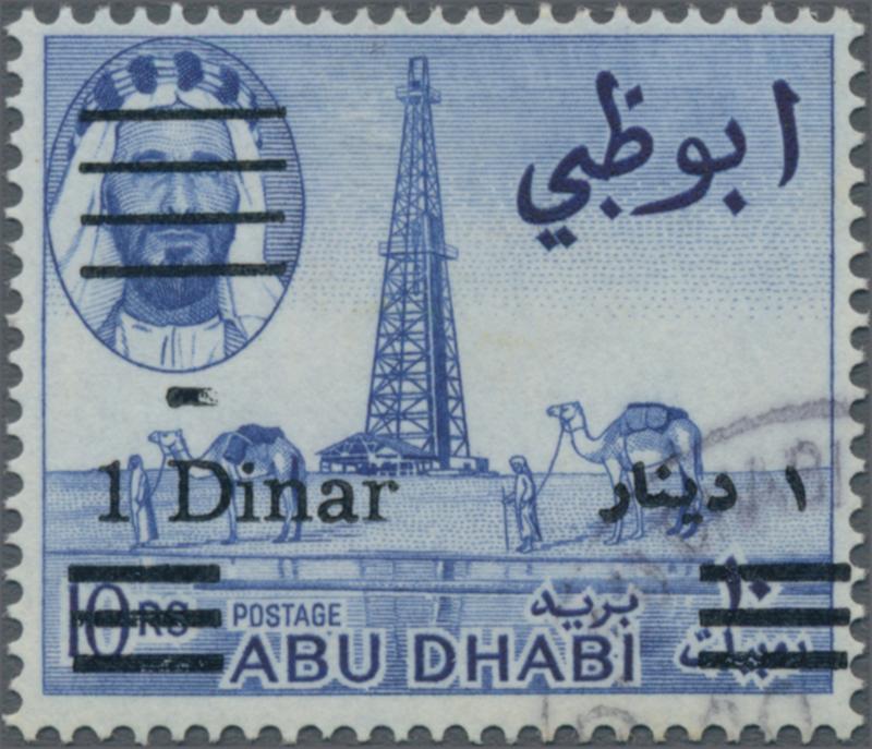 Abu Dhabi 1966 1d. on 10r. showing variety "short extra bar below portrait (R.7/3)", used with part Abu Dhabi c.d.s., fine. (unlisted by SG) Condition: o (used) Catalog number(s): SG 25a (Image)