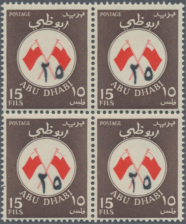 Abu Dhabi 1969 "25" on 15f. block of four, mint never hinged, fresh and fine. (SG from £1000) Condition: block of four/** (mint never hinged) Catalog number(s): 56, SG 27a (4) (Image)