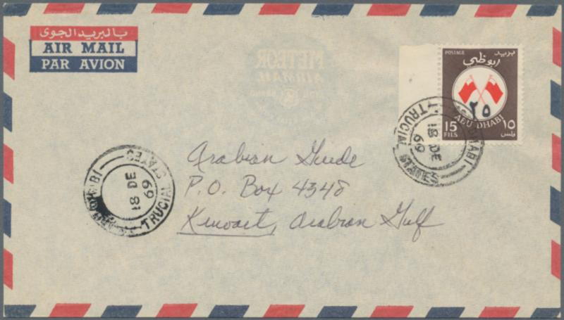 Abu Dhabi 1969 Provisional "25" on 15f., with sheet margin at the left, tied by "ABU DHABI TRUCIAL STATES 18 DE 69" double-circle datestamp to airmail envelope, with a second strike alongside, addressed to Kuwait, fine. Condition: Cover Catalog number(s): 56, SG 27a (Image)