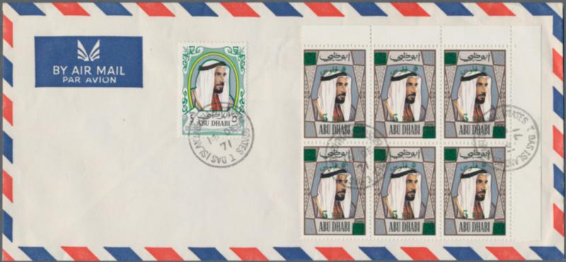 Abu Dhabi 1971 Provisional 5f. on 50f. top right marginal corner block of six along with 5f. definitive on plane airmail envelope, all cancelled "DAS ISLAND ABU DHABI TRUCIAL STATES 14 DE 71" cds, fine. Condition: o (used) Catalog number(s): A 80, SG 80 (6) (Image)