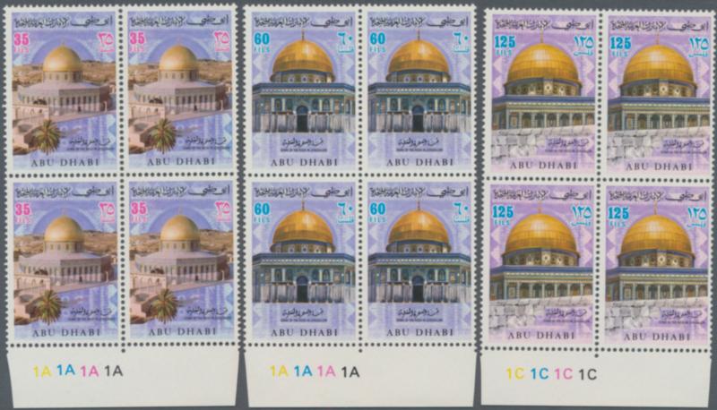Abu Dhabi 1972 'Dome of the Rock' complete set of three bottom marginal blocks of four, mint never hinged, fresh and very fine. Condition: block of four/** (mint never hinged) Catalog number(s): SG 81-83 (4) (Image)