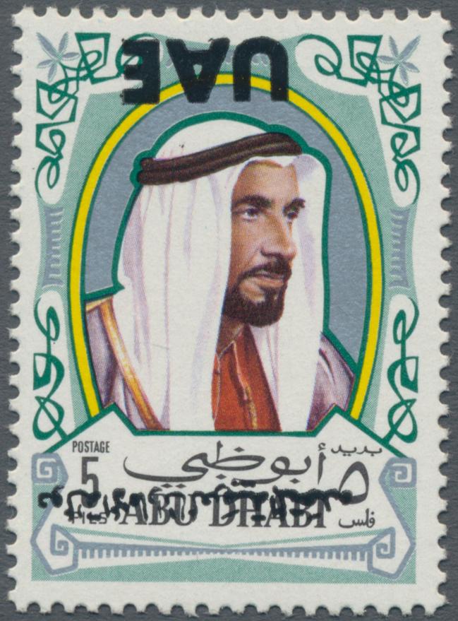 Abu Dhabi 1972 'Shaikh Zaid' 5f. optd. "UAE" with variety "OVERPRINT INVERTED", mint never hinged, fresh and fine. (SG £650) Condition: ** (mint never hinged) Catalog number(s): SG 84a (Image)