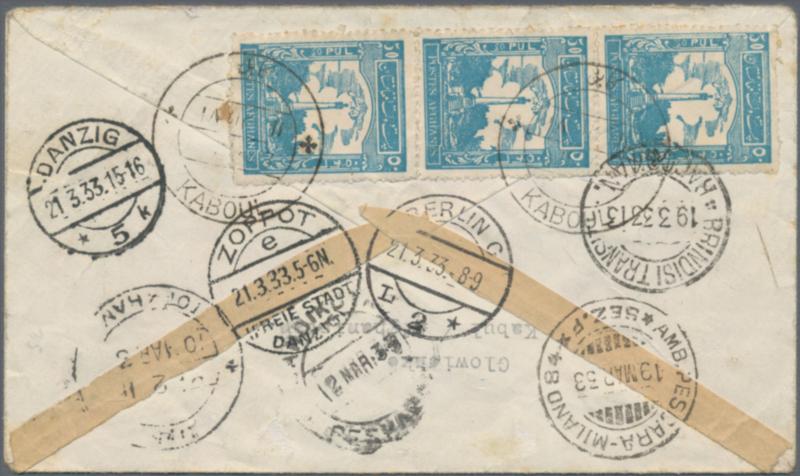 Afghanistan 1933 Airmail to Danzig, Germany via India, Italy and Berlin: Indian p/s airmail envelope 8a. franked on the reverse by Afghan 1932 50p. vertical strip of three tied by bilingual Kabul datestamp, p/s envelope cancelled Peshawar '12 MAR 33' dater, on front with Kabul registration h/s and red airmail confirmation h/s "Mit Luftpost befördert/Flugpostamt Danzig 5", and on the reverse with Afghan '10 MAR 33', Peshawar, Brindisi, Pescara-Milano and Berlin transit dater as well as Zoppot '21.3.33' arrival cds. Condition: postal stationery (Image)
