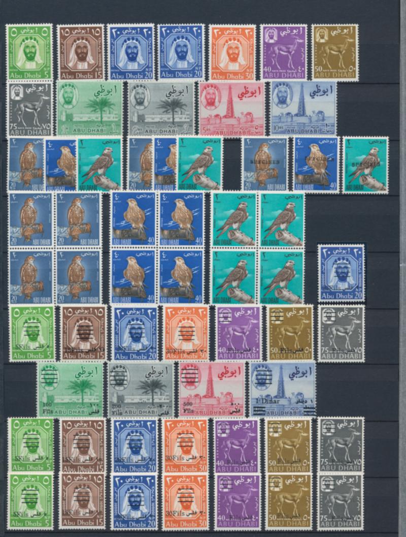 Abu Dhabi 1964-1972 Specialized collections of both mint and used stamps including all the good issues as 1966 new currency, 1969 "25" on 15f. etc. up to the last set both mint and used, plus a lot of multiples, and several FDCs. Condition: ** (mint never hinged)/* (mint hinged)/o (used) (Image)