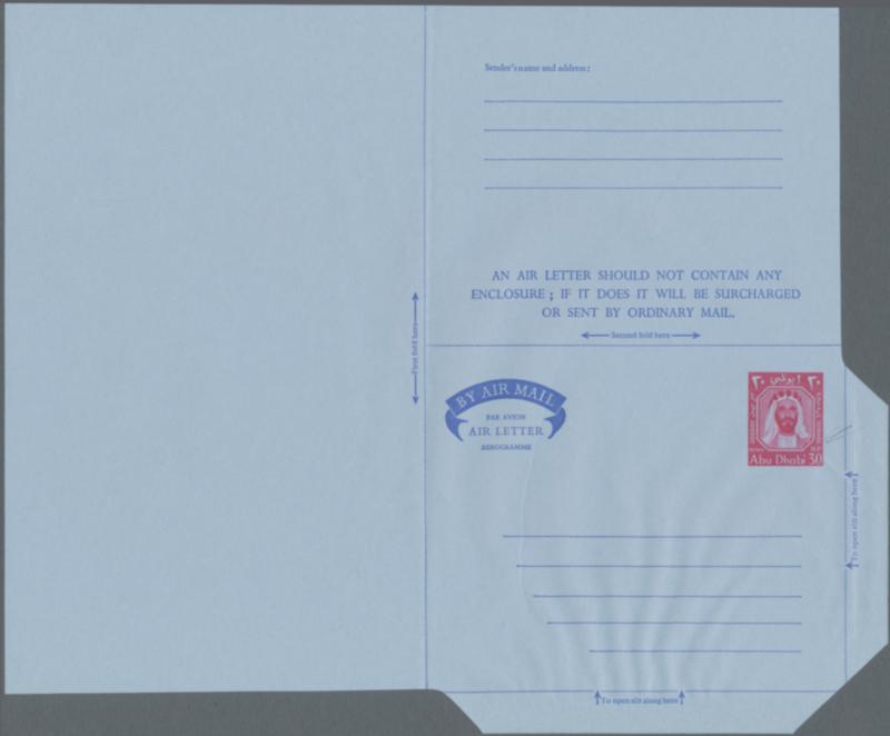Abu Dhabi 1964-1973 Air Mail Letter Sheets: Specialized collection of 34 postal stationery letter sheets, from first 1964 issue, almost all fine mint, few cancelled-to-order, including "SPECIMEN", various watermarks, and several varieties up to 1973 issue optd. U.A.E. Condition: postal stationery (Image)