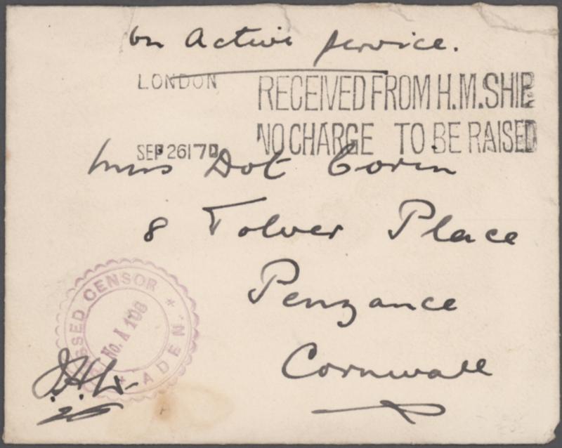 Aden 1916/1964, lot of five entires: 1916 field post card with straight line "PASSED BY CENSOR, ADEN", two 1918 field post covers each with circular "PASSED BY CENSOR ADEN No. A108", Seiyun 1948 Silver Wedding on registered cover, etc. Condition: Cover (Image)
