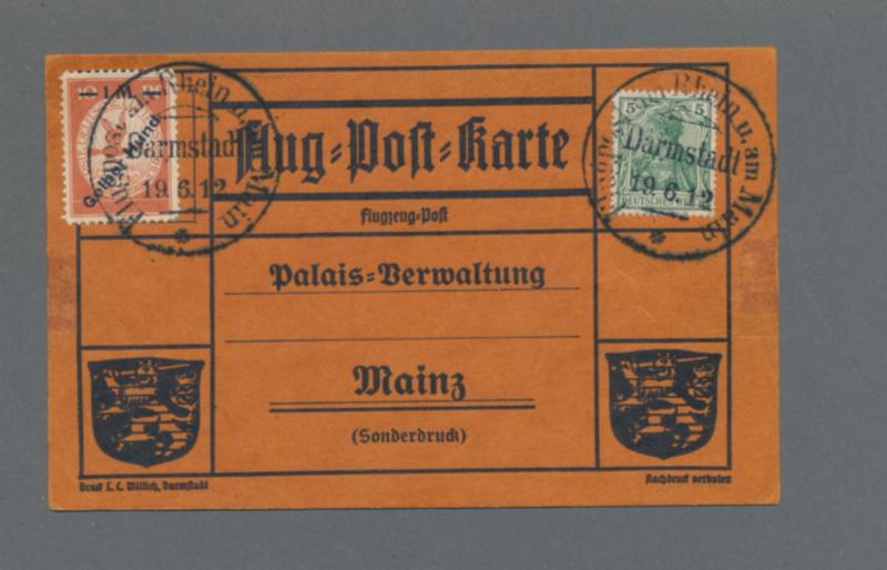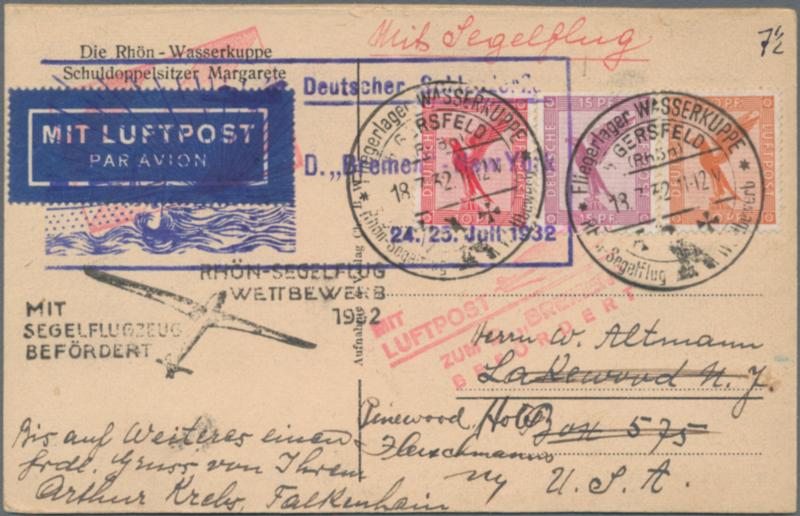Air Mail - Germany 1912/1932, Lot von sechs Belegen, dabei Ansichtskarten "Gordon Bennett-Wettfahrt Stuttgart 1912" und "Deutsche Taube im Kampf mit feindlichen Fliegern", Auslandskarte Rhein/Main (geschlossene Registraturlöcher), sowie Zeppelin-, DOX- und Schleuderflugpost. Condition: Cover/Picture Post Card (Image)