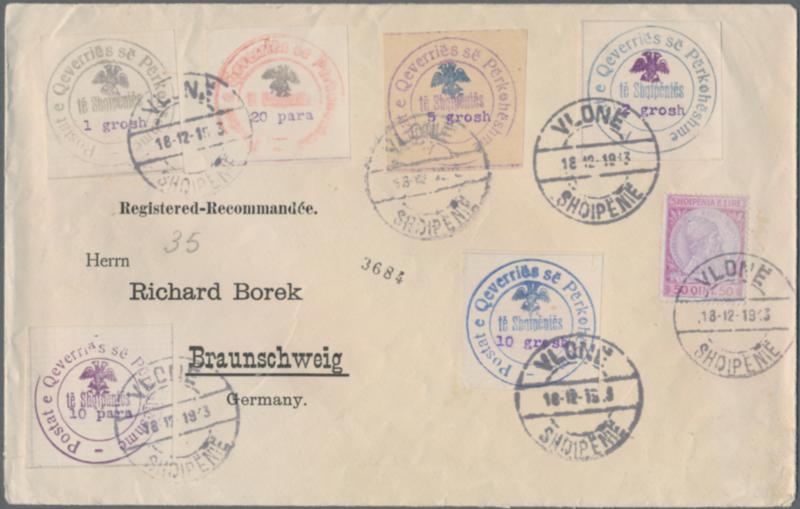 Albania 1913, typeset issue 10pa.-10gr., complete set of six in combination with Skanderberg 50q. on registered cover from "VLONE 18.12.13" to Braunschweig/Germany with arrival mark 23.12.13 on reverse, slight postal wear. Condition: Cover Catalog number(s): 18/23, 35 (Image)